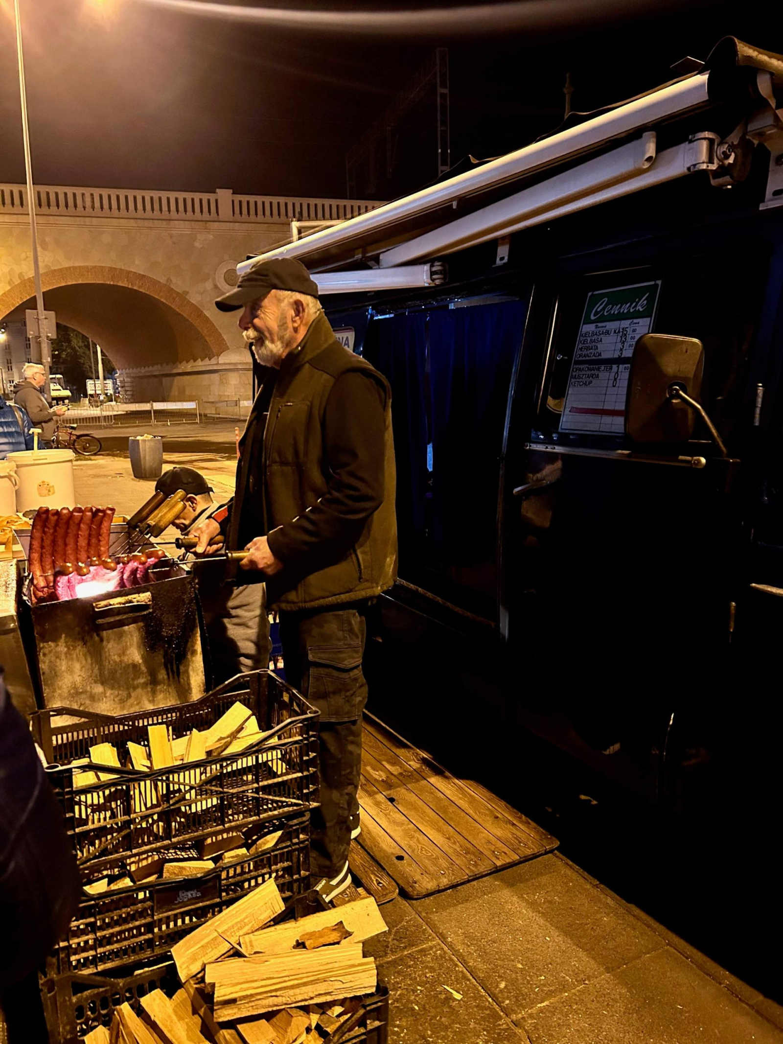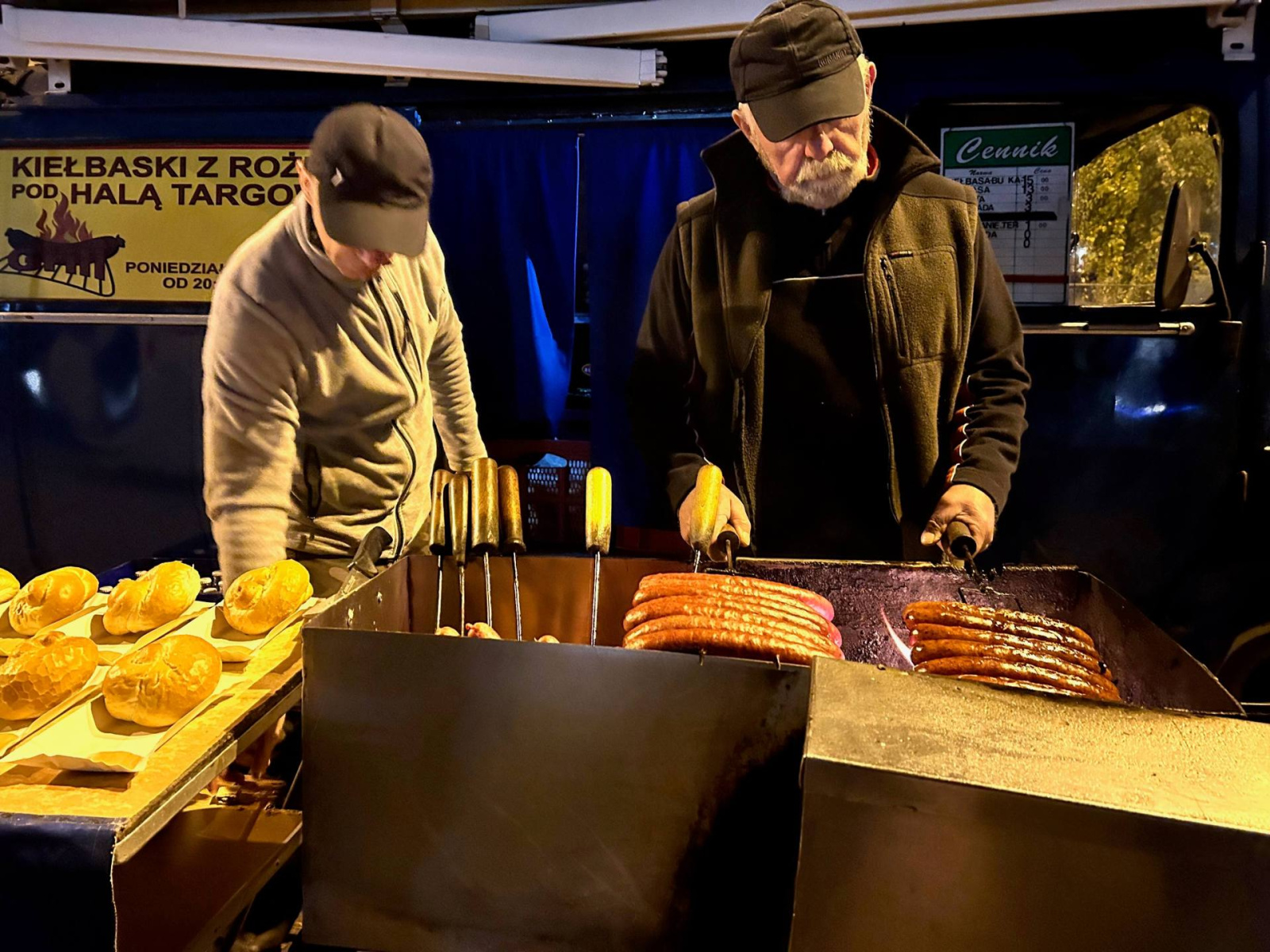If you’re considering a social evening, the square is a great destination with an array of lively bars. Our day concluded with cocktails here before strolling back towards our hotel. Before our trip, I’d researched another major stop-off point– the Blue Nysa Van – a street food van serving mouthwatering wood-fired Polish sausages (kiełbasa), which we were keen to try. This Krakow institution is super popular with locals and tourists alike and has been in operation for over 25 years. I would recommend, if not necessarily for the food, to go for the experience. If this does end up on your list of things to do, remember to bring cash, as it’s the only accepted form of payment.