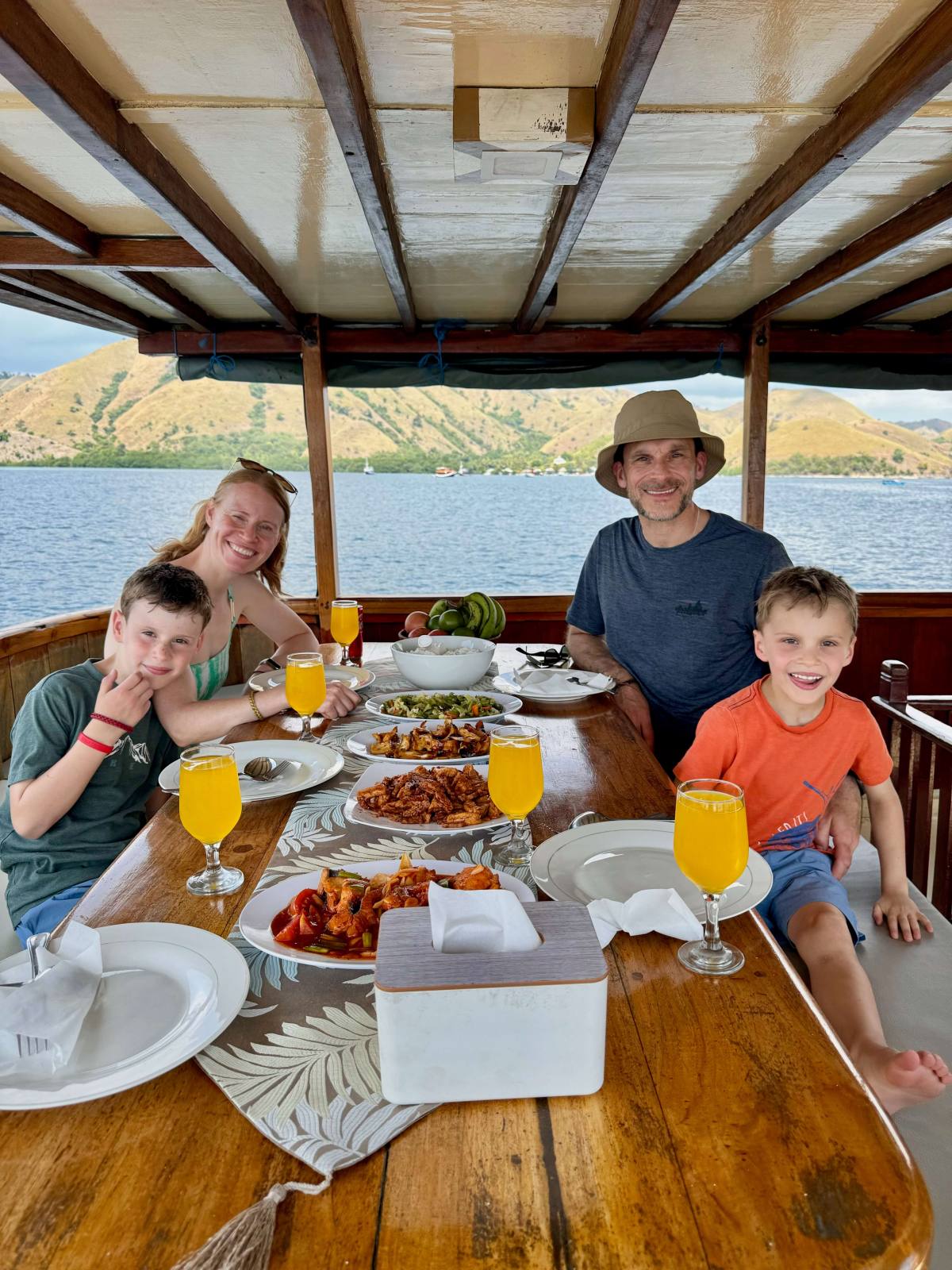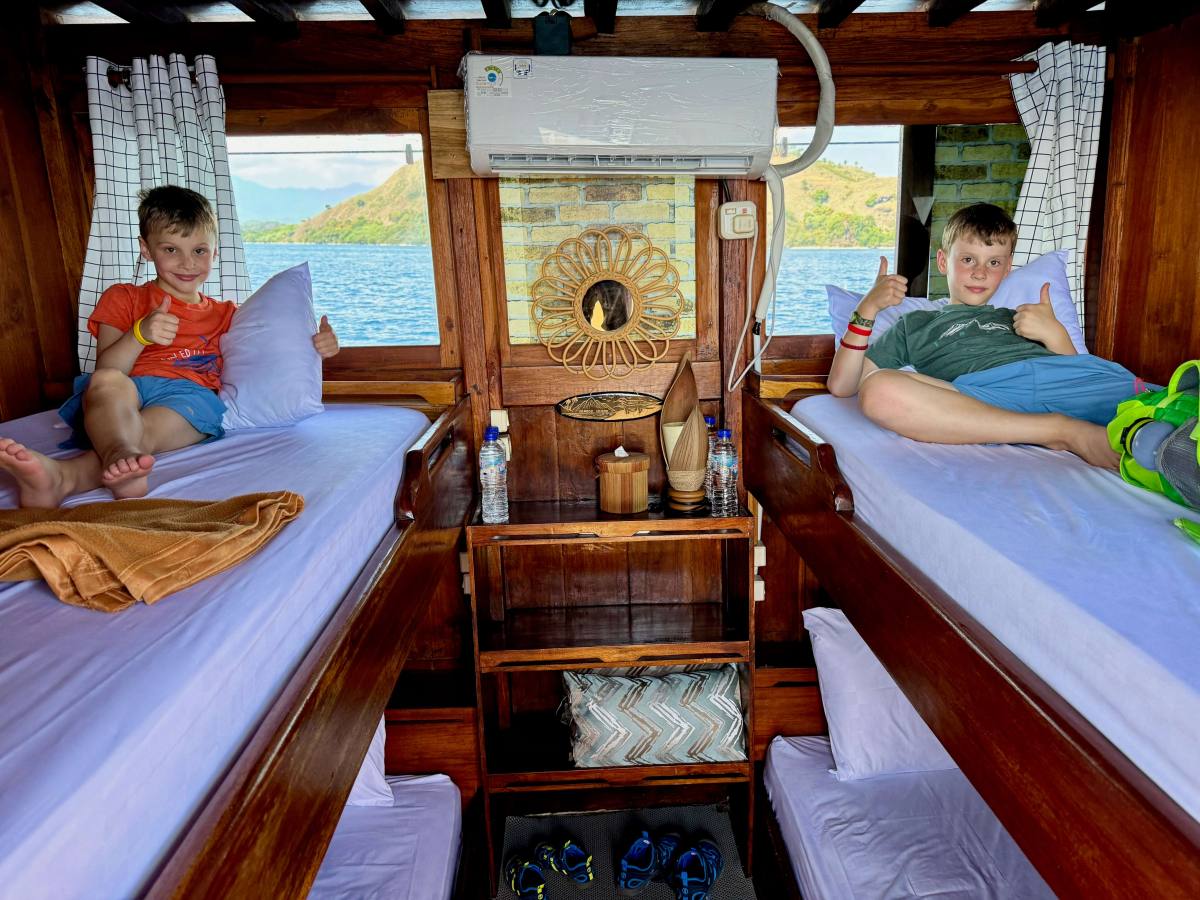 A short flight to Flores and we were met at the airport by our boat trip company. They took us straight to the boat, called Ayla, a beautiful wooden boat. There was just the 4 of us staying on the boat, plus 3 crew and our guide. The boat had 3 sleeping cabins (one with bunkbeds), two toilets with showers overhead and a top deck for us to relax and have our meals. The boat was basic (and the promised air conditioning didn’t work) but it was still lovely. The crew were great and so good with the kids. They let them drive the little speed boat and jump off the top deck into crystal-clear waters. The food was amazing, so tasty and fresh, and a good variety over the three days. There was always plenty that the boys would eat. We spent two nights onboard.