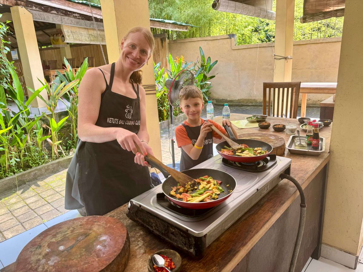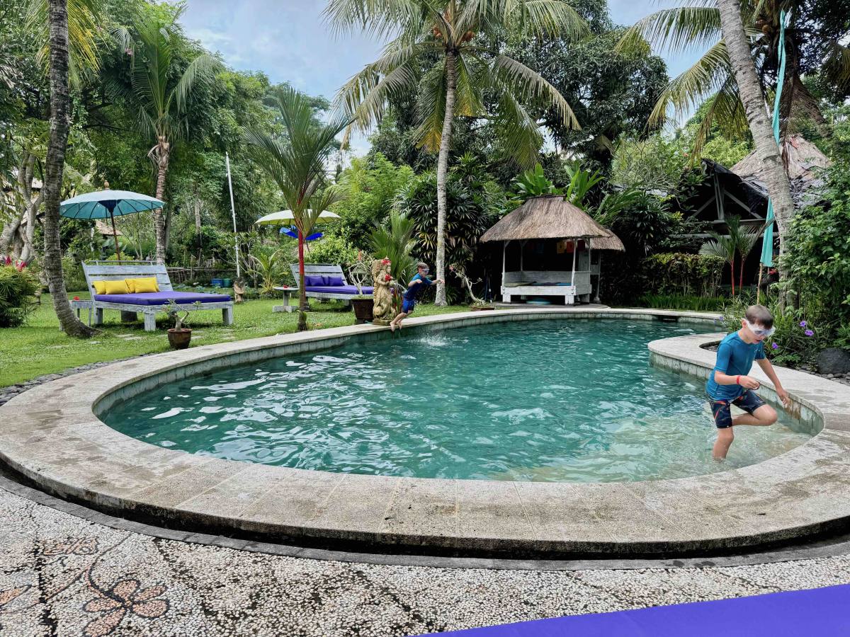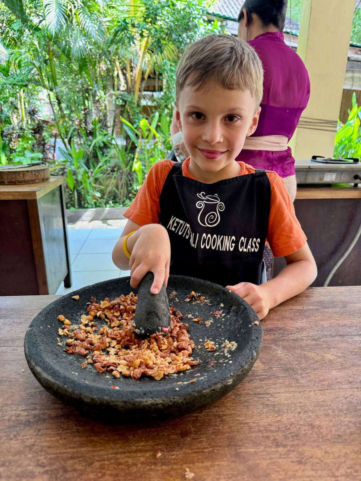 The best thing we did in Ubud was join a cookery class. We used Ketut’s Bali Cooking Class and would highly recommend it. It’s his own family run business and Ketut is a hilarious man who still runs the classes. It was very child friendly – we all had our own cooking station, including the boys, and we made an array of Balinese delicacies including chicken satay, bumbo bali, mee goreng and fried bananas. I’d say Reuben, aged 6, was the youngest you’d want them to do it. In Ubud we also hired a driver to take us to a few different local waterfalls, some of which you could swim in, a local temple, a butterfly park and to try the infamous cat poo coffee!