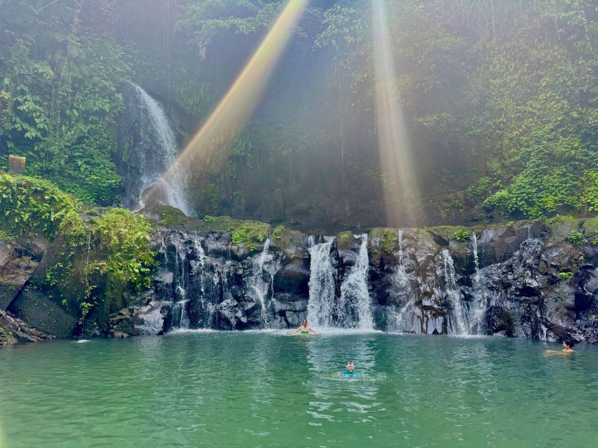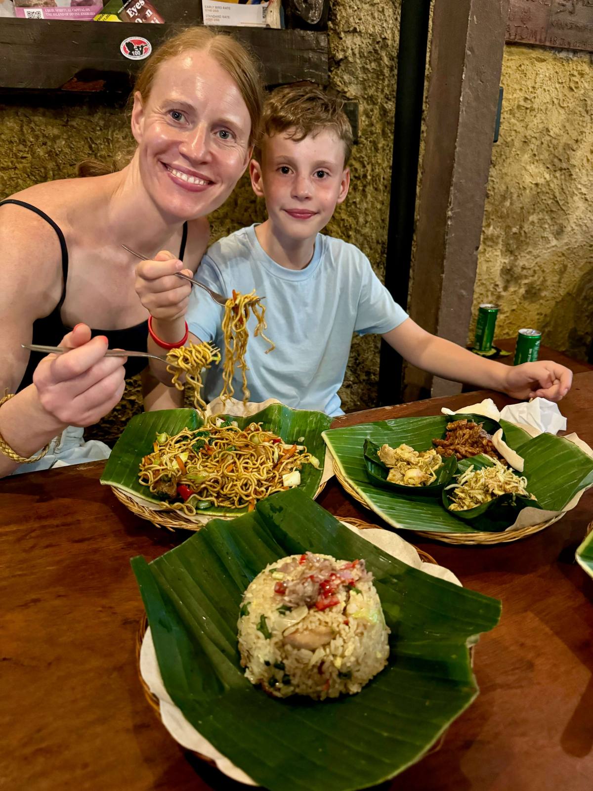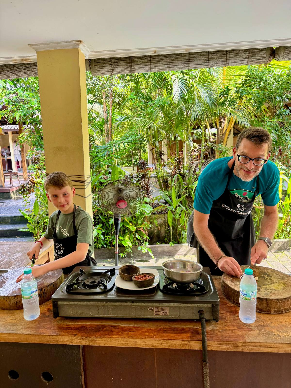 The best thing we did in Ubud was join a cookery class. We used Ketut’s Bali Cooking Class and would highly recommend it. It’s his own family run business and Ketut is a hilarious man who still runs the classes. It was very child friendly – we all had our own cooking station, including the boys, and we made an array of Balinese delicacies including chicken satay, bumbo bali, mee goreng and fried bananas. I’d say Reuben, aged 6, was the youngest you’d want them to do it. In Ubud we also hired a driver to take us to a few different local waterfalls, some of which you could swim in, a local temple, a butterfly park and to try the infamous cat poo coffee!