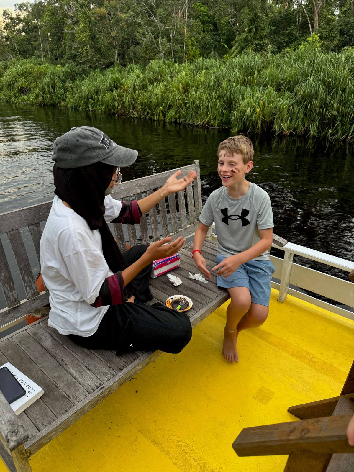 There are lots of tour companies offering similar Orangutan tours so it can be hard to choose but we went with ‘Local Guides’ as the cost was reasonable and they had excellent reviews. Our guide, Feetre, was so lovely and she knew a lot about the area and wildlife. There were also three other crew onboard, and the food was amazing. We slept in the open air on mattresses on the deck of the boat, with mosquito nets. At first, I was quite nervous about the boys sleeping on the deck so close to the edge of the boat, but we each shared a bed with them, and the mosquito nets were tucked under the mattresses which made them secure. Even so, there were crocodiles in the river so you really couldn’t risk falling in the water!