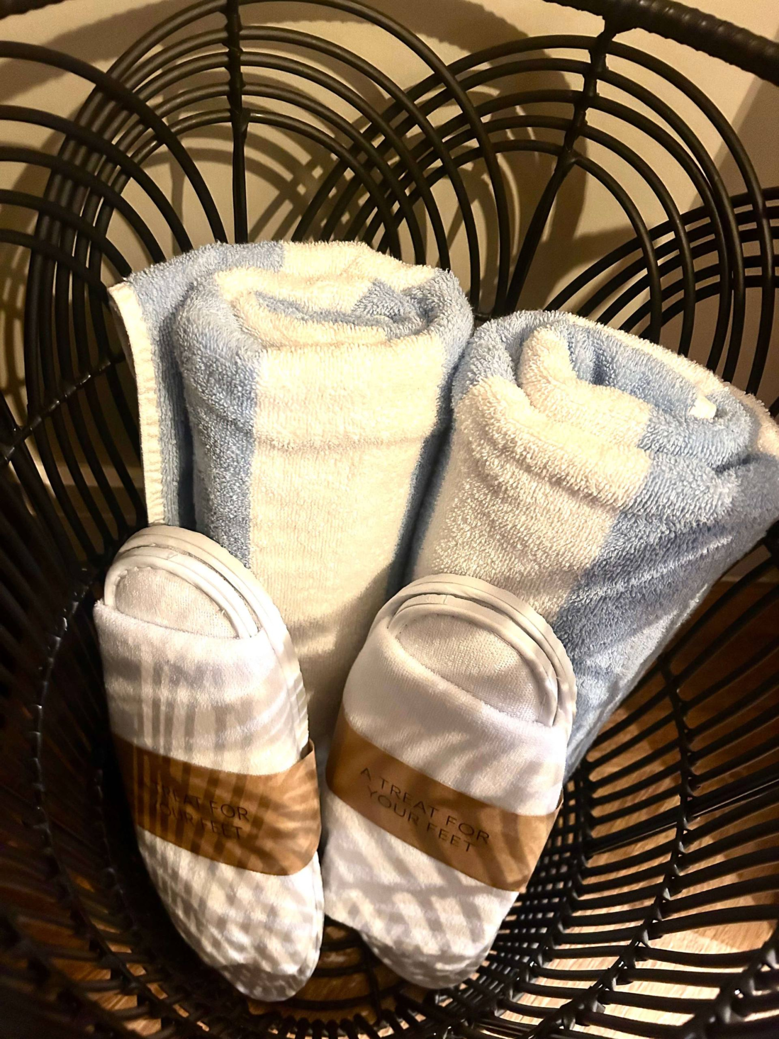 Thoughtful touches, such as a little Christmas tree in the lounge area and remote-operated LED candles gave us all the festive feels and we were delighted to see a basket of fresh, fluffy towels and flip-flops for us to enjoy the ultimate hot tub experience.