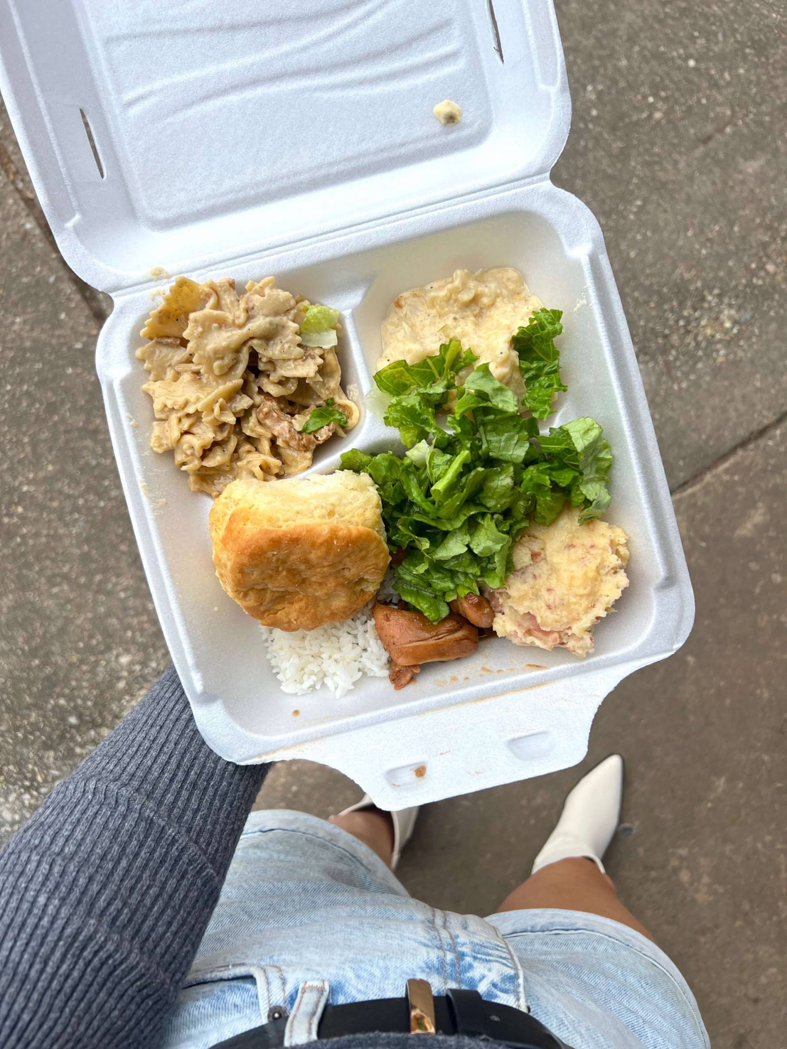 A Louisiana plate lunch typically consists of a a plate loaded with comfort foods like smothered pork or crawfish étouffée and accompanied by hearty sides such as Mac and cheese, fried okra, dirty rice and more. Each person can pick a different combination of meat and sides.