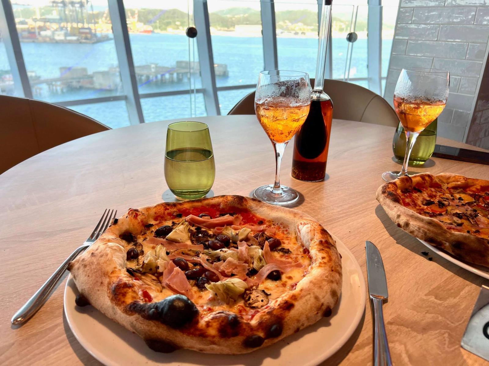 After getting to enjoy so much delicious and indulgent dining whilst on board our cruise, we were craving the simplicity of a casual one-course meal, so on the final evening we took a trip to Alfredoโs Pizzeria. Having dined at the Alfredoโs on Enchanted Princess, I knew the wood fired pizzas are brilliant and have previously been voted the โBest Pizza at Seaโ. We got a great table in front of the Sphere in the Piazza, just in time for the final sail away of the cruise.