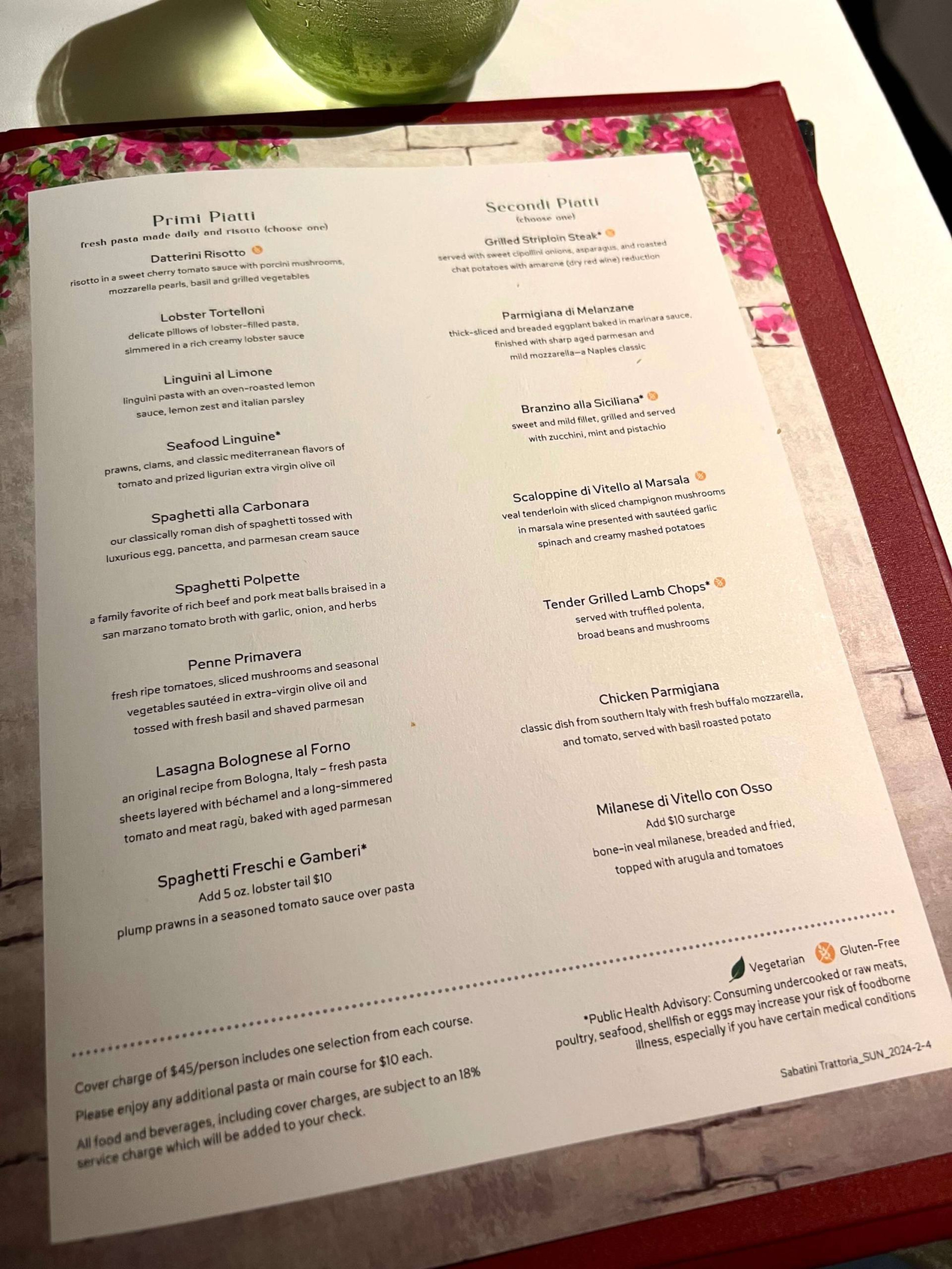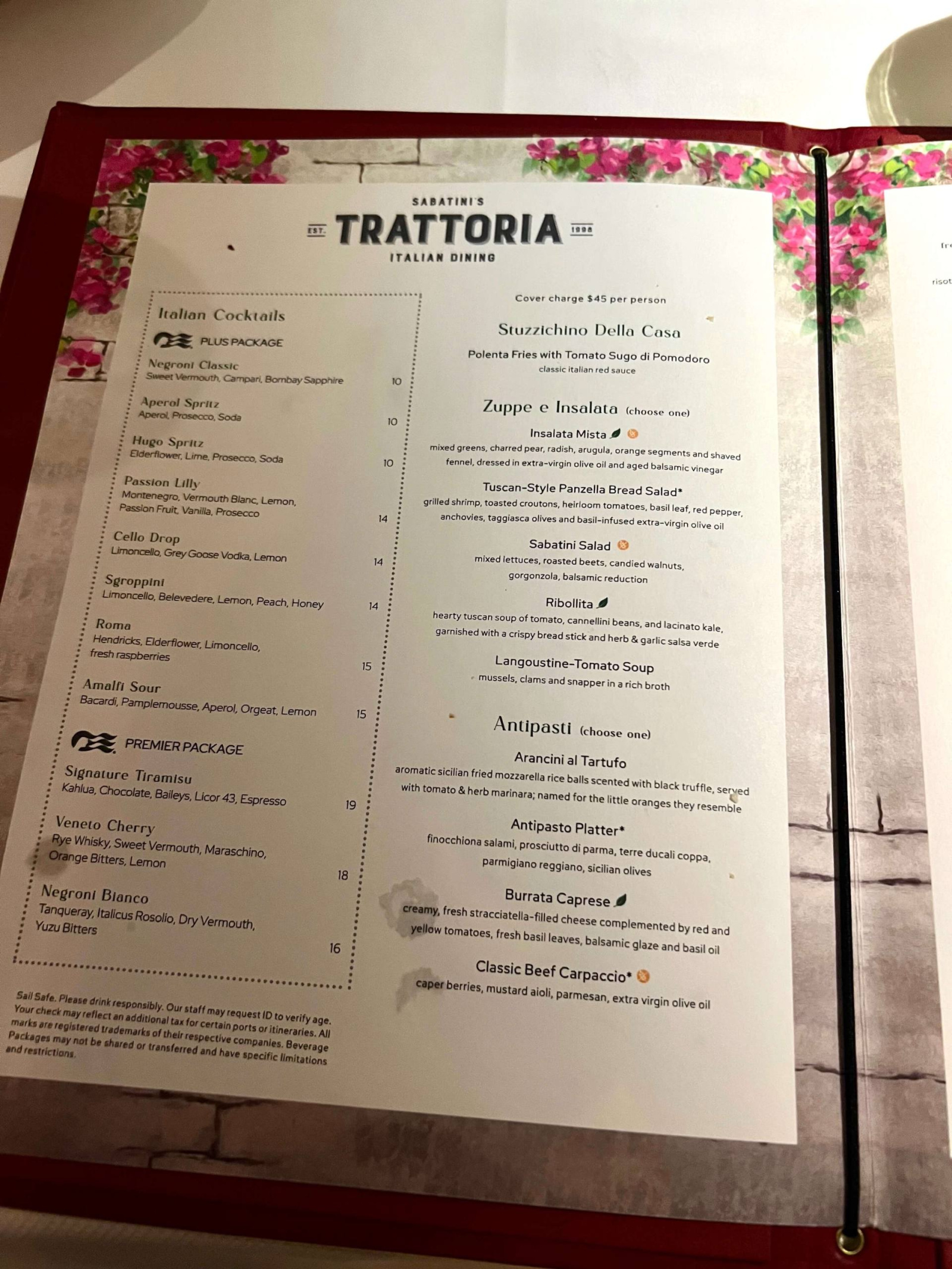 Sabatiniโs Italian Trattoria ($45 cover charge) or Included with Princess Premier