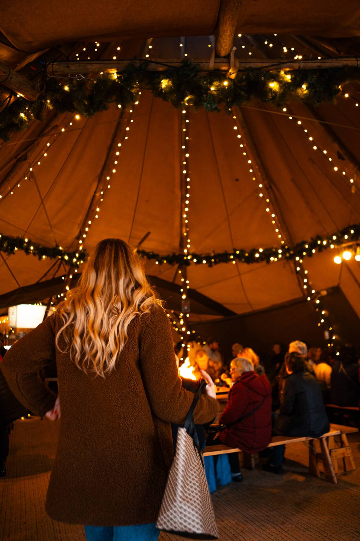 Another brilliant aspect of the Barnsley Christmas Market 2024 was the indoor Tipi. Inside you could enjoy a cosy mulled wine or a hot chocolate with whipped cream by a roaring open fire pit. There was a great atmosphere in here and with no queue outside at the time, we were straight in. The weather in December can always be unpredictable but the indoor Tipi at Barnsley Christmas Market was a guaranteed festive experience come rain or shine.