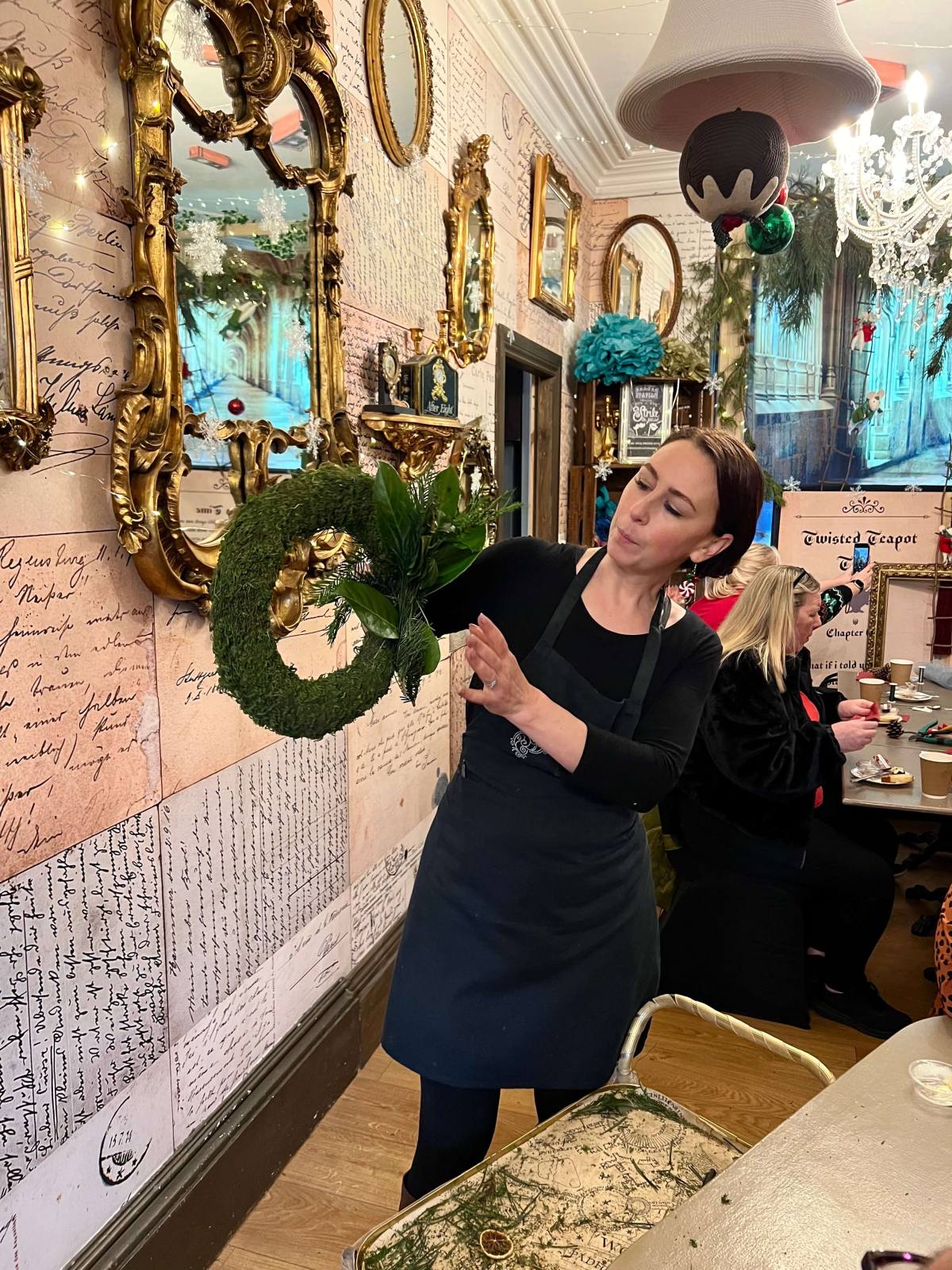 The wreath making workshops consist of a cream tea with a selection of mince pies, stollen, lemon drizzle and scones with clotted cream and jam. Each guest helps themselves to these on arrival and the owners work their way around the tables doing the wreath demonstrations using fresh foliage and decorations. All the materials and tools are supplied as part of the experience and sessions cost £43.50 per person and you come away with a beautiful handmade wreath.